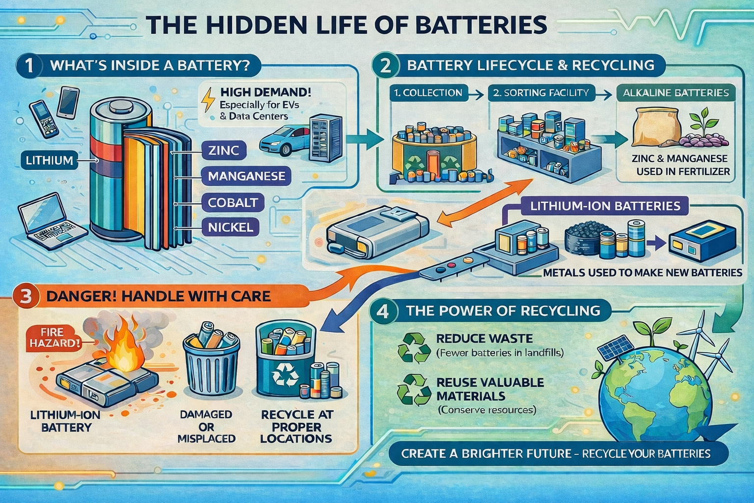 In this activity, you will explore what batteries are made of; how they are used; what happens when they stop working or are damaged, defective, or recalled (DDR); and how to dispose of them properly through recycling.